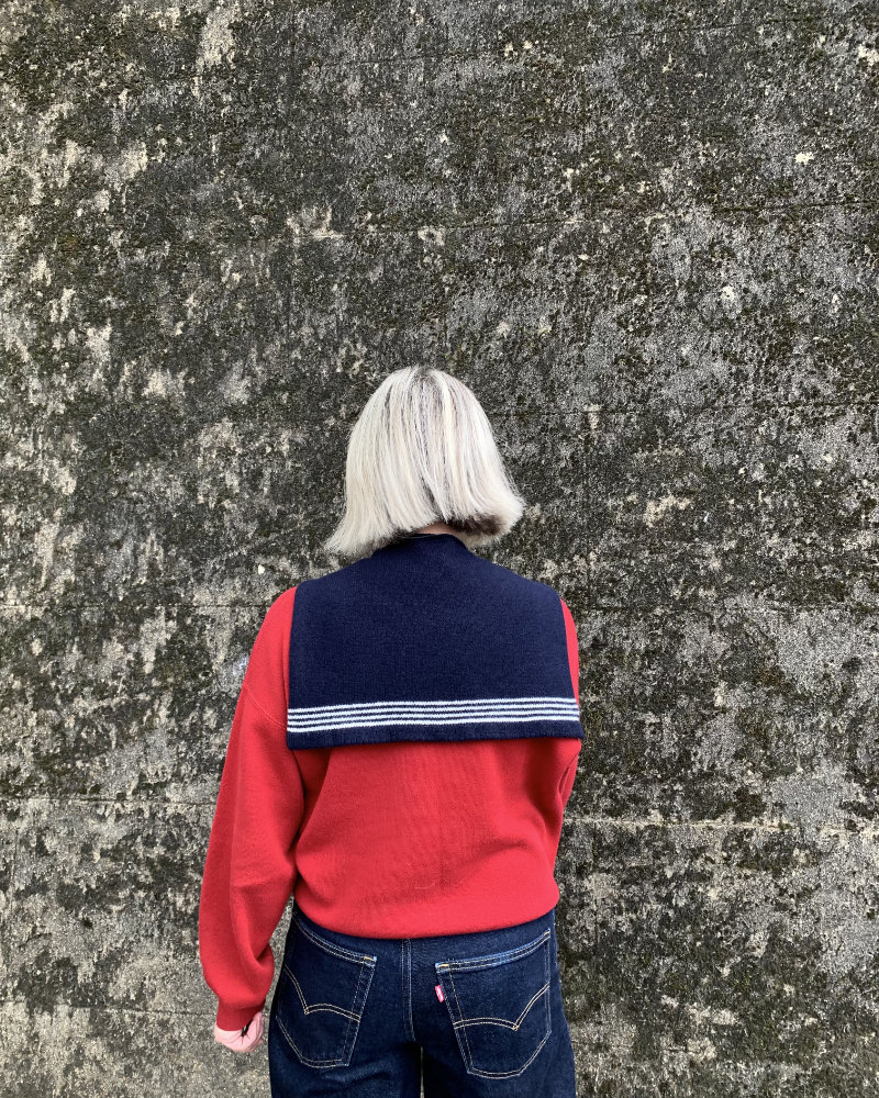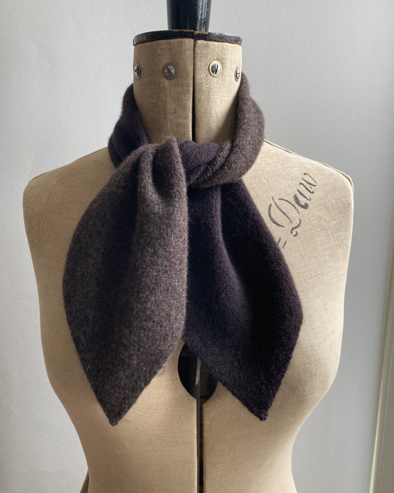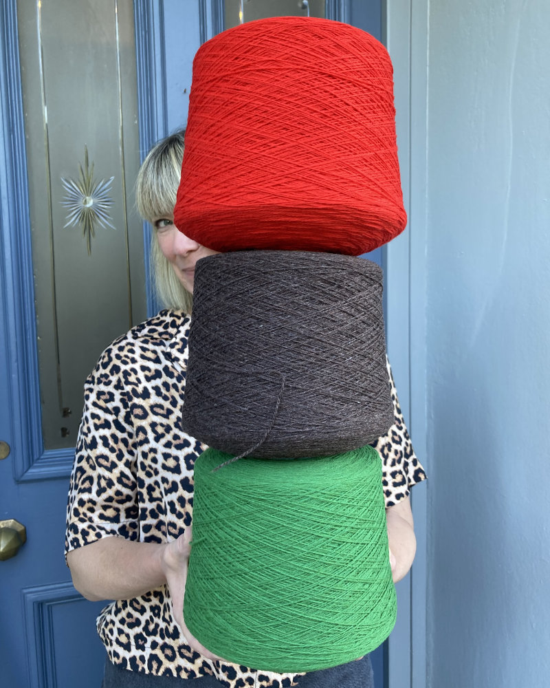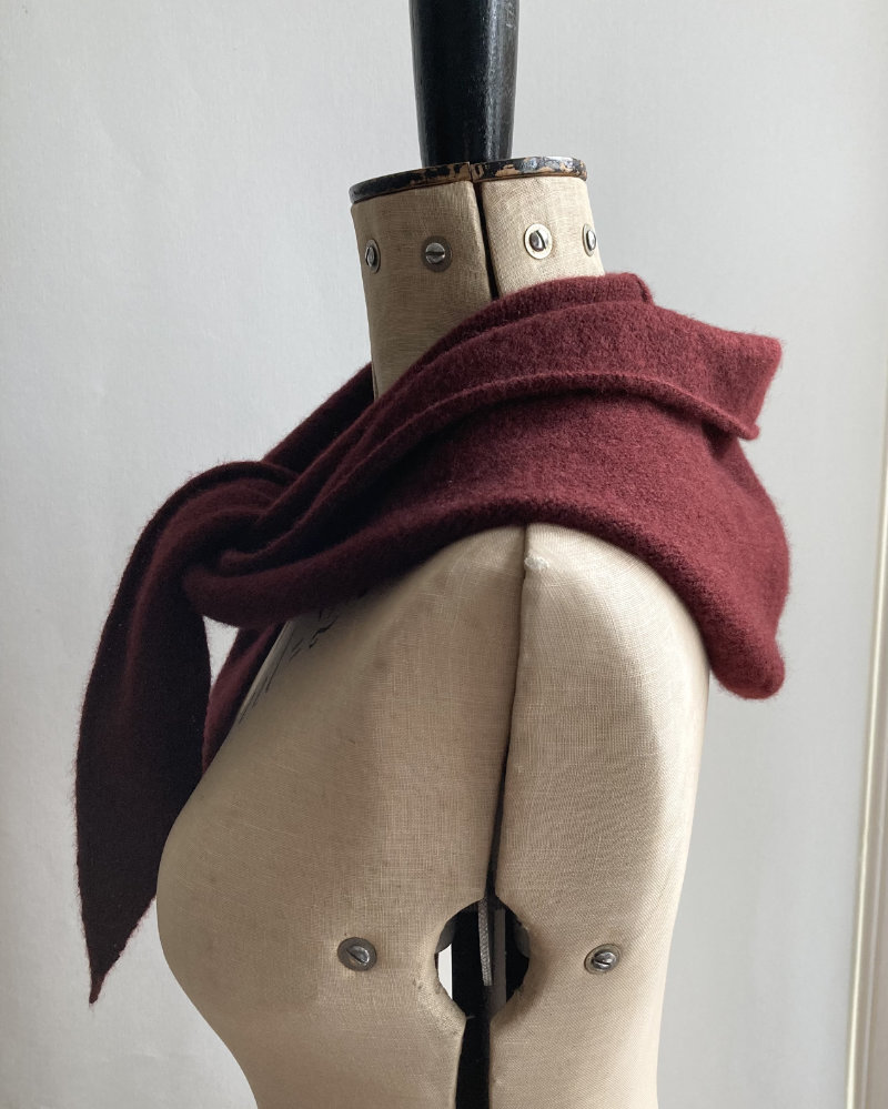 The lambswool pieces are knitted on a hand powered vintage knitting machine, and sewn on her precious heirloom sewing machine.