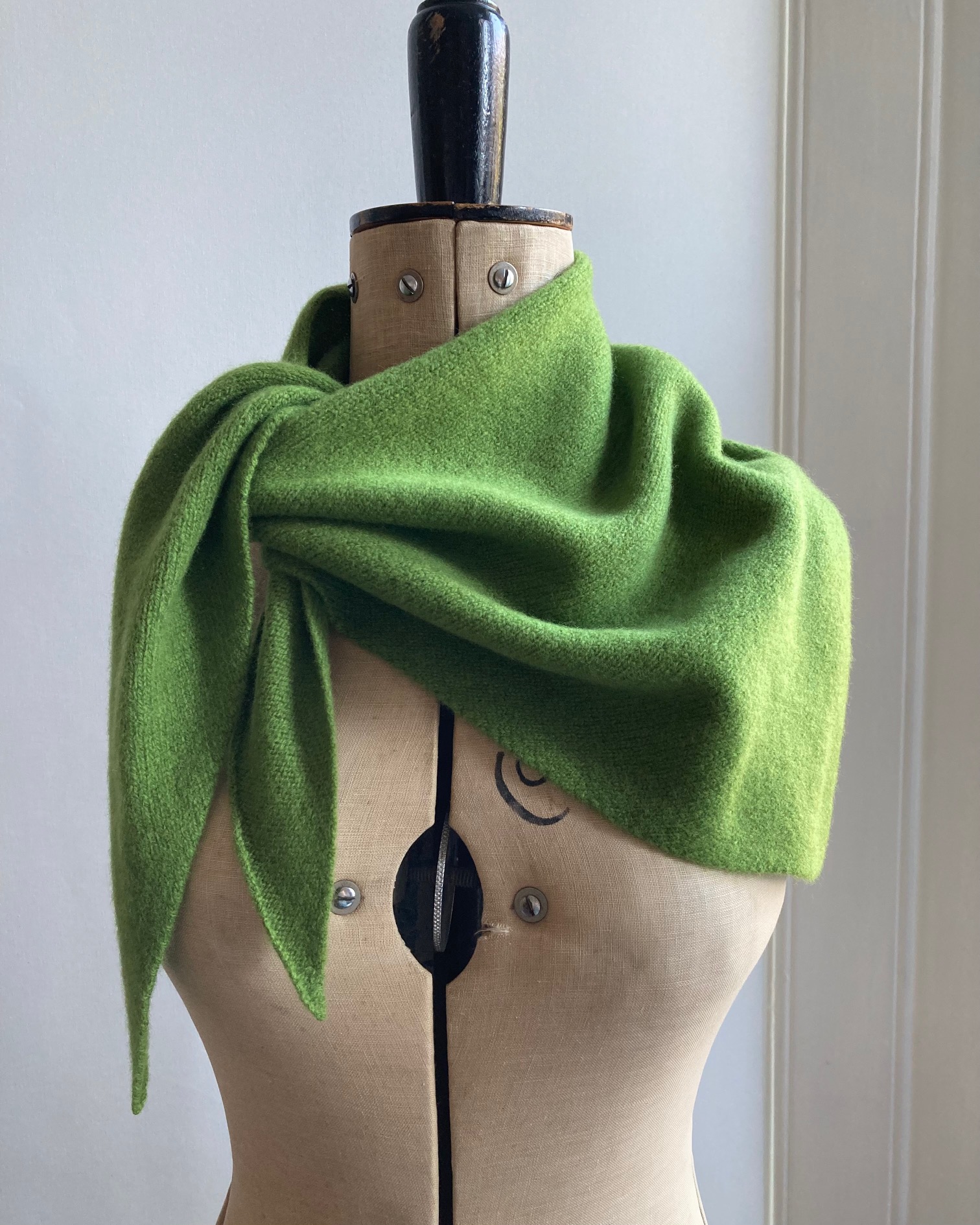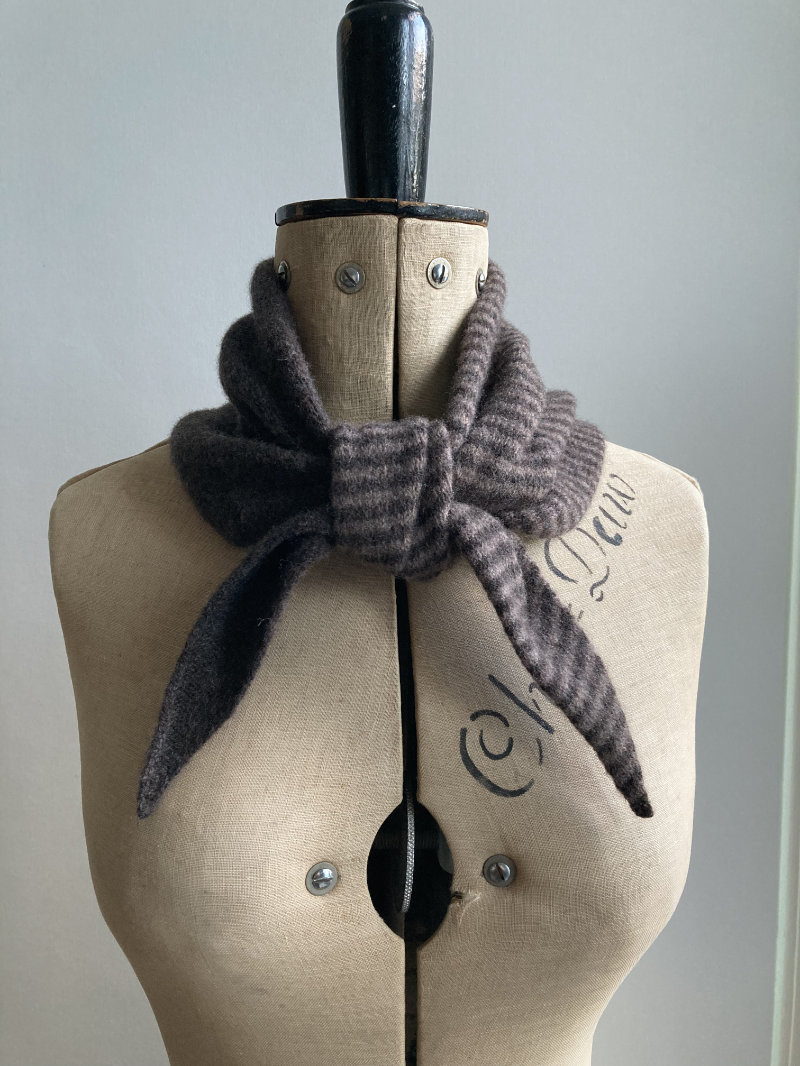 The lambswool pieces are knitted on a hand powered vintage knitting machine, and sewn on her precious heirloom sewing machine.